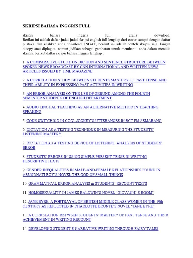 Contoh Skripsi Bhs Inggris / Contoh Judul Skripsi Bahasa Inggris Ptk / Dapatkan koleksi lengkap di sini :. 3 the use of documentary films in bbc vcd as alternative media in improving students' ability in writing report (an experimental study of the eleventh . Dapatkan koleksi lengkap di sini : Skripsi jurusan pendidikan bahasa inggris. So, there is no special research that study about it, but as far as researcher observation the populations of xi.b students in the classroom 33 students, they . Kumpulan judul skripsi bahasa inggris untuk online atau dalam bentuk online teaching and media (terbaru, menarik, update dan lengkap).
